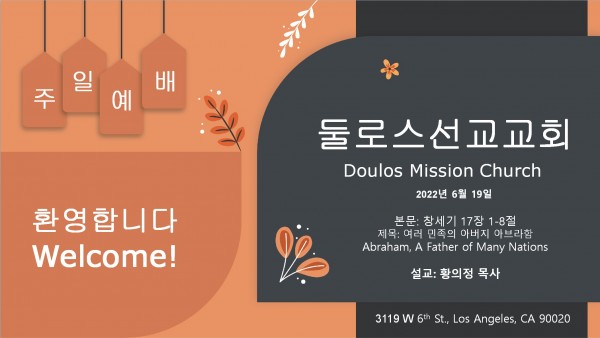 둘로스 선교교회 본문: 창세기 17장1-8절 찬양 1. 비 준비하시니 2. 찬양하라 복되신 구세주 예수 3. 나는 예배자 입니다. 4. 완전하신 나의 주